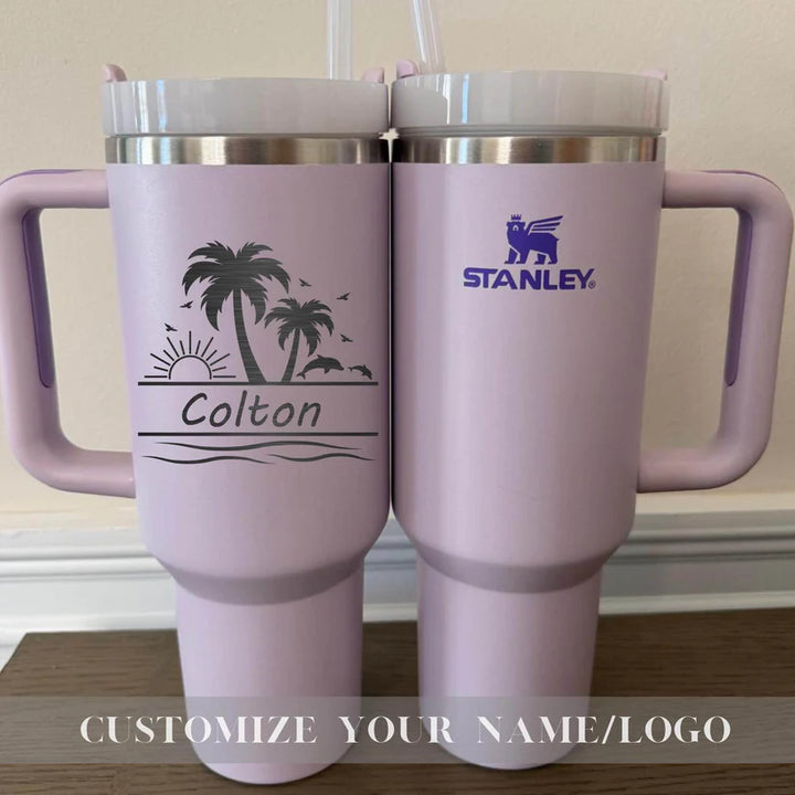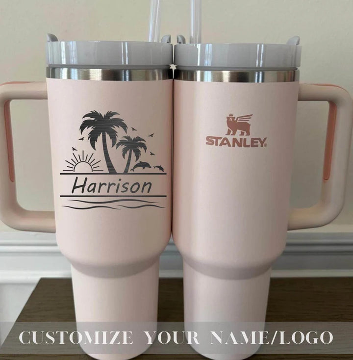 BEACH TUMBLE, PALM Tree Tumbler, Stylish Travel Mug, Personalized Beach Tumbler with Straw, Custom Engraved Travel Mug for Girls Your Unique gift is just a step away-Start Personalizing Now! Personalized Stanley 40oz Vacation Tumbler, Beach Tumbler, Custom Travel Mug, Girls Weekend Gift, Laser Engraved Stanley Cup, Gifts for Her Stanley Quencher H2.0 with Straw Tumbler with Leak proof Lid 40 oz - Built-In Straw & Handle - Cup holder Compatible for Travel - Insulated Stainless Steel Cup - BPA-Free - All Colors are available Whether you're on a hike, commuting, or running errands, ensures you stay hydrated wherever life takes you. Product Details: Hot: 7 hours Cold: 11 hours Iced: 2 days Weight: 1.4 lbs Dimensions: 3.86" L x 5.82" W x 12.3" H Made with 90% recycled 18/8 stainless steel and BPA-free materials. The tumbler includes a recycled stainless steel icon inside, signifying its sustainable construction. Other features: Double-wall vacuum insulation Screw-on 3-position lid Reusable straw Comfort-grip handle Car cup holder compatible (base diameter: 3.1 inches) Add this durable, eco-friendly tumbler to your collection today and take your hydration game to the next level! Shipping: Orders are processed within 1-6 business days. You’ll receive a tracking number once your order has shipped. Return Policy: As each item is made to order, we do not accept returns or exchanges. If you experience any issues with your order, please don’t hesitate to reach out. If you have any questions about the product or ordering process, feel free to contact us! Thank you for supporting our small business! Us Engravo ,Personalized Tumbler with Lid,Custom Laser Engraved Travel Cup,Engraved Wedding Tumbler,Custom Tumbler for Teacher,Engraved Tumblers for Women,Custom Tumbler with Name,Engraved Insulated Drinkware,Unique Personalized Tumbler,Custom Tumber for summer