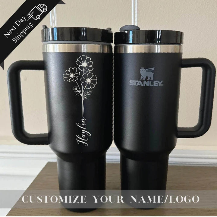 Your Unique gift is just a step away-Start Personalizing Now! Personalized Birth Flowers Stanley 40oz Tumbler With Name, Stainless Steel Tumblers With Straw, Custom Birth Month Flowers Cup Birthday Gift Stanley Quencher H2.0 with Straw Tumbler with Leak proof Lid 40 oz - Built-In Straw & Handle - Cup holder Compatible for Travel - Insulated Stainless Steel Cup - BPA-Free - All Colors are available Whether you're on a hike, commuting, or running errands, ensures you stay hydrated wherever life takes you. Product Details: Hot: 7 hours Cold: 11 hours Iced: 2 days Weight: 1.4 lbs Dimensions: 3.86" L x 5.82" W x 12.3" H Made with 90% recycled 18/8 stainless steel and BPA-free materials. The tumbler includes a recycled stainless steel icon inside, signifying its sustainable construction. Other features: Double-wall vacuum insulation Screw-on 3-position lid Reusable straw Comfort-grip handle Car cup holder compatible (base diameter: 3.1 inches) Add this durable, eco-friendly tumbler to your collection today and take your hydration game to the next level! Shipping: Orders are processed within 1-6 business days. You’ll receive a tracking number once your order has shipped. Return Policy: As each item is made to order, we do not accept returns or exchanges. If you experience any issues with your order, please don’t hesitate to reach out. If you have any questions about the product or ordering process, feel free to contact us! Thank you for supporting our small business! Us Engravo ,Personalized Tumbler with Lid,Custom Laser Engraved Travel Cup,Engraved Wedding Tumbler,Custom Tumbler for Teacher,Engraved Tumblers for Women,Custom Tumbler with Name,Engraved Insulated Drinkware,Unique Personalized Tumbler,Custom Tumber for summer