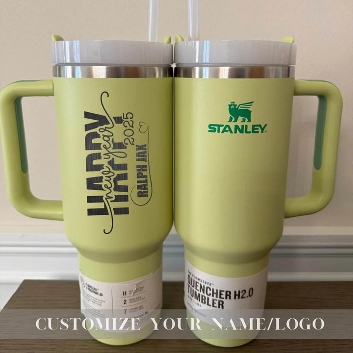 Your Unique gift is just a step away-Start Personalizing Now! Personalized STANLEY CUP TUMBLER 40oz - Custom Engraved Happy New Year with Name Gifts for Her Him Women - 2025 New Year Gift - Stanley Cup Stanley Quencher H2.0 with Straw Tumbler with Leak proof Lid 40 oz - Built-In Straw & Handle - Cup holder Compatible for Travel - Insulated Stainless Steel Cup - BPA-Free - All Colors are available Whether you're on a hike, commuting, or running errands, ensures you stay hydrated wherever life takes you. Product Details: Hot: 7 hours Cold: 11 hours Iced: 2 days Weight: 1.4 lbs Dimensions: 3.86" L x 5.82" W x 12.3" H Made with 90% recycled 18/8 stainless steel and BPA-free materials. The tumbler includes a recycled stainless steel icon inside, signifying its sustainable construction. Other features: Double-wall vacuum insulation Screw-on 3-position lid Reusable straw Comfort-grip handle Car cup holder compatible (base diameter: 3.1 inches) Add this durable, eco-friendly tumbler to your collection today and take your hydration game to the next level! Shipping: Orders are processed within 1-6 business days. You’ll receive a tracking number once your order has shipped. Return Policy: As each item is made to order, we do not accept returns or exchanges. If you experience any issues with your order, please don’t hesitate to reach out. If you have any questions about the product or ordering process, feel free to contact us! Thank you for supporting our small business! Us Engravo ,Personalized Tumbler with Lid,Custom Laser Engraved Travel Cup,Engraved Wedding Tumbler,Custom Tumbler for Teacher,Engraved Tumblers for Women,Custom Tumbler with Name,Engraved Insulated Drinkware,Unique Personalized Tumbler,Custom Tumber for summer